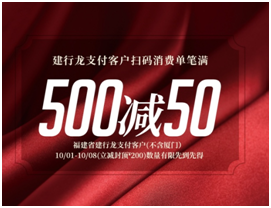 建行龙支付客户(福建省建行龙支付客户,不含厦门)在世纪金源奥特莱斯广场扫码消费单笔满500元立减50元。活动期间,全场累计可享受三次,三次优惠总金额封顶200元,数量有限,先到先得(部分自营门店不参加此次活动)。