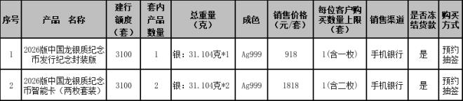 1.应有关要求,本次贵金属纪念币面向实名客户销售,2026版中国龙银质纪念币发行纪念封装版和2026版中国龙银质纪念币智能卡(两枚套装)采用“预约抽签”方式确定可购买的客户。本产品对应的每位客户购买数量上限等请见本公告第一条中“具体产品信息”内容。