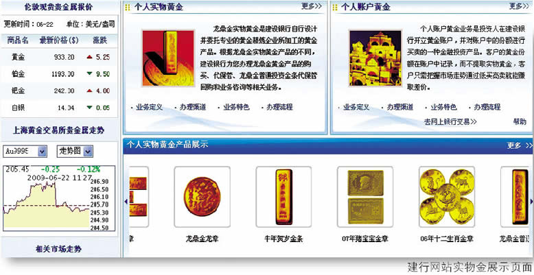 建行黄金频道近期做了改版,在改版后的页面客户能够更加清楚的了解建行“龙鼎金”个人黄金业务,包括个人实物金、个人帐户金买卖办理的须知和流程,建行黄金业务动态,国际和国内现货金价格的走势图等。相比改版前,新版的黄金频道还增加了大量的黄金市场资讯。龙鼎金实物黄金是建设银行自行设计并委托专业的黄金精炼企业所加工的黄金产品,建设银行为客户办理龙鼎金黄金产品的购买、代保管、龙鼎金普通投资金条代保管回购和业务咨询等相关业务。