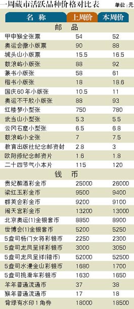 温馨提示:从本期起,为了满足读者对于收藏品市场价格动态的需求,我们将推出包含“邮品、钱币市场行情的”《藏品动态》栏目,旨在为读者提供更丰富的市场最新资讯。《拍品赏析》栏目将在四版“雅玩”专版中继续刊登。 一周藏市简述 本周市场热点此起彼伏,不少品种价格再创新高。如邮市上的新邮热点降温与“老邮”价格上扬,形成了热点切换局面,特别是编号票的全套价格已升至万元关隘,而“庚申猴”邮票再度创出5500元历史新高,“梅兰芳”、“奔马”和“红楼梦”小型张已攀高至65000元、3000元和780元。币市方面,受国际金价上扬,2009版“熊猫”1盎司金币重回8000元整数关,而第三套人民币中的“车工”2元券(古币水印)价格臻至1000元,投资者可继续关注。