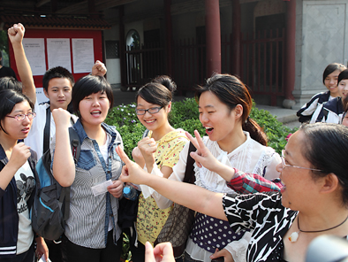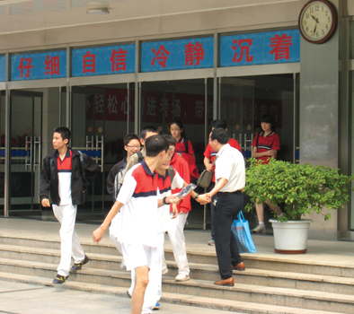 6月26日上午十点半,北京市为期三天的中考结束,北师大实验中学门口的考生在结束考试走出考场后,与等待在门口的老师击掌庆祝。