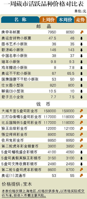 邮市方面:大多数近期热点品种小幅回调,成交不佳。但第二轮生肖全张票全线飘红,觅货者络绎不绝,其中“庚辰龙”、“己卯兔”和“辛巳蛇”分别创出1620元、210元和600元历史新高。