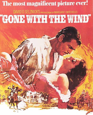 1939年由维克多·弗莱明导演的《乱世佳人》成为影坛经典,电影海报以剧中亚特兰大的火光冲天为背景,配合火红的暖色调,夸张而鲜明地表达出英雄怀抱美人的浓烈爱意。反映了手绘海报对高饱和度色彩充分而大胆的运用。