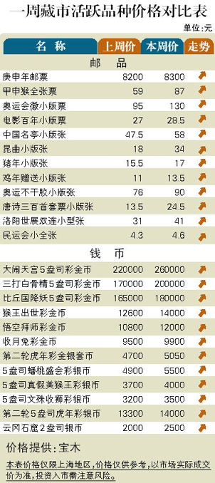 邮市方面:小版张回调后即大幅上涨,一周上涨50%品种达40余种,其中2成价格翻番。如古代书院(2昆曲小版张以及唐诗三百首套票小版张均在5天内翻番,而行书洛阳世展国庆60小版张涨幅也超50%。受此影响,近期表现撩眼的编号票无奈甘拜下风。币市方面:5盎司彩金币大幅走高,京剧和水浒系列升幅均超1成,而其它1/2盎司彩金币也跟风扬升。第四版人民币炒作虽热,但因短线升幅较大,买气略下降。
