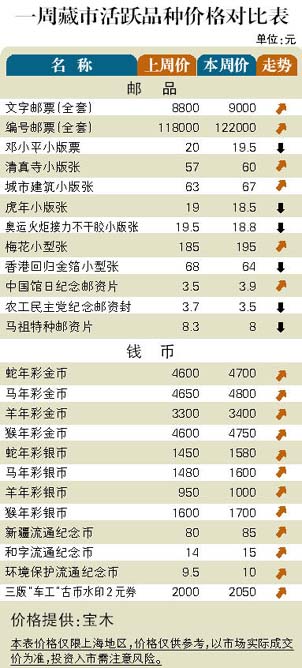 市场在10月中旬走势继续逞强,尤其是伴随着国际金银价格的快速攀升,金银币全线飙升,市场成交明显放大。邮市方面:热点新邮冲高回落,震荡上扬格局未改。但JT邮票表现渐强,辛酉鸡全张票快速暴涨至29000元,兰花避暑山庄孔子小型张分别上涨到69元、13元和30元,中美邮展小版张扬升至7100元。币市方面:热点全面开花,尤其是彩金币中的贵妃醉酒梁红玉黛玉夺魁夸父追日和彩收玉兔价格分别创出60000元、18800万元、30500元、13000元和16000元,而迎春图国色天香戴胜鸟彩银币分别涨升到380元、355元和360元。