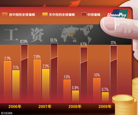 日前,国际劳工组织(ILO)在日内瓦最新发布了涵盖全球16亿工薪阶层的《全球工资报告2010-2011》。报告显示,金融危机后全球工资增速几近折半。而中国增速 “引涨”全球工资,超欧美国家达5倍之多。图片作者:EG365/CFP