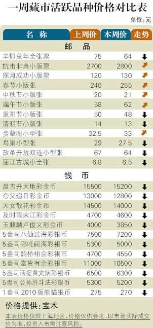1月上旬,邮币市场维持调整状态,市场热点有所减少,尤其是新邮抛压出现,令市场观望气氛趋浓。邮市:1月5日发行“辛卯兔”邮票出现高开低走表现,其全张票和小版张分别由75元和45元下滑到本周初的64元和31元,受此影响,年初攀升的第三轮生肖版张全线回落,如“甲申猴”、“丁亥猪”、“戊子鼠”和“庚寅虎”全张票分别下滑到145元、61.5元、60.8元和59元,而“行书”、“资本市场”小版张分别回调至98元和76元。币市:金银币回升力度有限,说明调整尚未结束,本周“辛卯兔”抛压仍然沉重,其中彩金银套币跌至4800元附近,5盎司彩银币下滑到12000元。此外,“戊寅虎”、“己卯兔”、“庚辰龙”和“丙戌狗”彩银币分别在4000元、2000元、2050元和12800元左右盘旋。