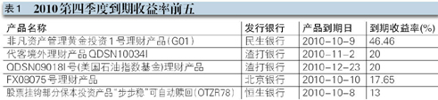 实现正收益的产品中,到期收益率超过20%的产品有三款。其中,民生银行旗下产品--非凡资产管理黄金投资1号理财产品(G01)于20107月发行,期限为1年。收益结构安排如下:
