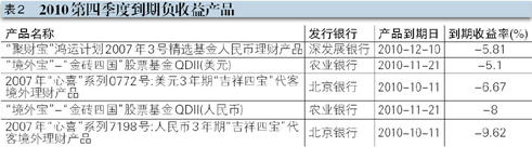 在未实现预期收益的20款产品中,其中有5款产品到期收益为负,且投资对象均为基金。其中,亏损幅度最大的产品为北京银行——“2007心喜系列7198号:人民币3年期吉祥四宝代客境外理财产品。该产品成立于200710月,期限为3年。产品资金主要投资于美林集团发行的以美元计价的3年期票据 -- 美林全球精英基金组合票据(境外票据),且在80%的情况下,尽可能扩大对全球精英基金组合的投资比例,而全球精英基金组合由摩根士丹利亚洲房地产基金、怡富中国基金、邓普顿环球均衡增长基金与贝莱德美林世界矿业基金四只基金组成,组合比例均为25%。然而,四只基金在金融危机的2008年严重受累,最终以-9.62 %收官。(表2