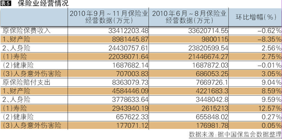 本季度保费收入总体持续下滑,2010年9月~10月(截稿时官方数据仅更新至2010年8月,因此选取2010年9月~10月这三个月作为一个统计季度)保险业保费收入较上一个季度微降0.62%,下降幅度较上季度小9.7个百分点。与保费收入走势相反,本季度原保险赔付持续增加,增幅为9.04%。其中寿险增幅最大,赔付额为294.39亿元,较上季度增加12.57%;人身意外伤害险增长幅度最小,赔付额为0.05%。(表5)