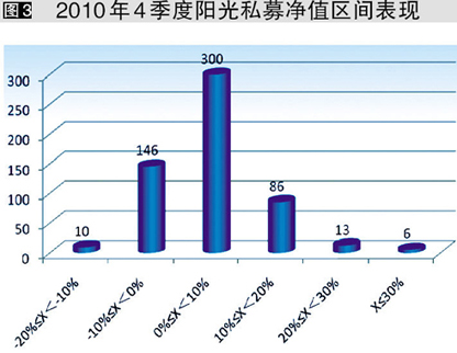 普益财富监测数据显示,阳光私募产品的净值平均增长4.54%,不仅涨幅上季度减少近5个百分点,而且跑输大盘逾1个百分点。其中,从收益区间分布看,本季度阳光私募产品的收益率区间主要集中于0%-10%区间,占比达53.48%。(图3)
