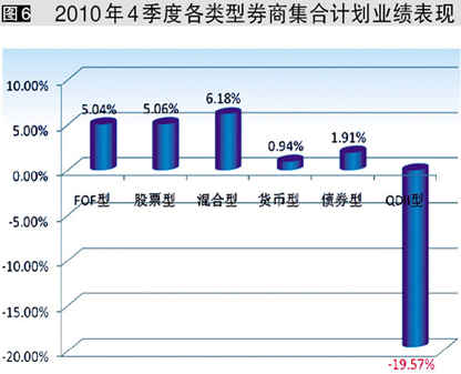 受益于A股市场的上涨,本季度各类券商集合产品全线收红,但是收益较三季度大幅回落。其中,东北证券2号成长精选集合资产管理计划以13.07%的收益成为收益率最高的股票型产品。(图6)