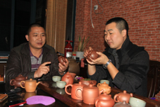 小军30多岁,丁山人,话不多,专心为我们倒茶。之前听高艺扬讲,小军做这行已经多年,最早是代工,现在有自己的工作室。见着小军,高艺扬兴奋许多,话也明显增多,一边品茶一边回忆起9年前他第一次来宜兴的情景,那时他在南宁刚刚开了茶叶店,卖铁观音、普洱,也想捎带着卖些紫砂壶。听说宜兴一些工艺师的壶市场行情不错,就一个人跑到宜兴进壶。但他对宜兴毫不摸门,根本不知道到哪去找工艺师,他在宜兴整整逛了一天,累了也烦了,正当茫然无助时遇见了小军,听明白高艺扬的来意,小军立即放下店里的活儿,骑着摩托车带着高艺扬到丁山乡下去找当时几个不错的工艺师……“宜兴人挺傲的!但小军不一样!”小军的热心相助让高艺扬很感动。那一次,他们并没有做生意,高艺扬感慨地说:“先交朋友。”小军也笑着附和:“做生意先从做人开始。”