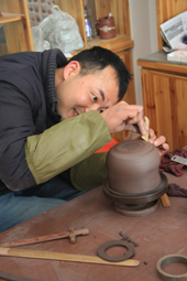 小军继续说,判断一把壶的好坏,一看是否是好料,二看形状,还要看个人喜欢。“像你们这样的外行人,不管是在北京还是丁山,都要通过熟人去买,或到正规的壶店去买。现在有许多模子压出来的壶(非手工制作),只卖一百多块。你记住只要是紫砂料,又是手工制作,不可能卖这么便宜。”