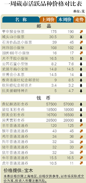 邮市:近期热邮在春节前止跌回稳,不少品种重新攀升,春节期间梅兰竹菊小版张和无齿小版张分别上扬到50元和350元,第三轮生肖版张也非常活跃,而双连小型张中的洛阳世展改革开放邮联六大分别回升至70元、52元和31元附近。