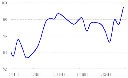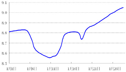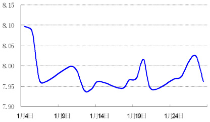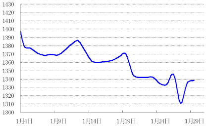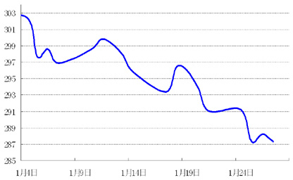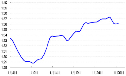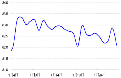 上周美国四季度GDP3.2%,略逊于市场预期3.5%,但仍显示该国经济正步入稳步复苏阶段,尤其是经济增长动力转向私人部门,库存对经济贡献度下降,显示经济增长质量好转。但美元走势与经济数据关系不大,突尼斯和埃及动乱升级,导致避险买盘大举建仓,美元强势反弹。美元指数本周交投区间在77.60~78.50,收于78.15。欧元上周涨势趋缓,周五突如其来的动乱升级,导致欧元大跌,吞噬本周前期所有涨幅。欧元本周交投区间1.3537~1.3758,收于1.3610。日元受评级机构调降日本主权债务评级影响,周四大跌,但仅仅维持一天后因避险买盘买入影响大涨。日元本周交投区间在81.95~83.21,收于82.11