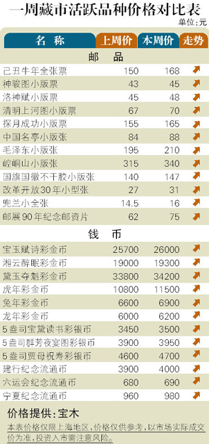 元宵节前夕,市场出摊率回至正常状态,由于市场热点不断,成交格外火爆,令不少邮商提前赶回市场上班。邮市:第三轮生肖版张振荡上扬,呈你追我赶创新高形态,本周初乙酉鸡庚寅虎辛卯兔全张票分别创出102元、88元和94元新高,。此外,一些低价品种补涨,其中邮政110年(会员)小版张扬升到20元,而小型张中的香格里拉洛阳世展分别上攀至12.5元和24元。币市:金银币小幅反弹,但成交并不活跃,短期整固格局延续。纪念流通币中的生肖品种上扬,其中羊年走高到140元,虎年攀升至17.5元,而海宝流通币上涨到10元附近。