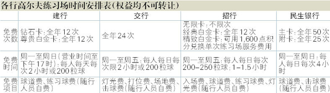 建行钻石卡除了全年28场一流球会免费联谊赛、全年12次高尔夫练习这两项权益之外,还可享受全国100家一流球会,全年18次平日免果岭费礼遇。持卡人每次最多可携带3名嘉宾同行,携带嘉宾使用次数计入持卡人年度免果岭费使用次数的统计。周一至周五任何时段均可预定。白金卡持卡人年度12次平日免果岭费礼遇。交行可享全年平日免18洞果岭费,同时全国高尔夫球场优惠,享受果岭3-8折优惠。不同于国有商业银行,民生银行专属球场可享受主卡全年20场免费,附卡全年10场免费。招行无限卡在全国近30家知名球会尊享6次免费下场击球权益,超过次数可享受专属优惠价及预定金额10%现金返还优惠。此外独树一帜的是还可体验不限次境外高尔夫。