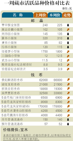 3月上旬的市场热点切换,编号和JT票上扬品种逐日增加,而热点新邮继续调整,惟回落空间有限。邮市:JT票成交活跃,其中四五计划从小爱科学古代科学家(3西游记套票分别攀升到1050元、90元、460元和430元。编号票中的阿尔巴尼亚工业机器分别创出530元和2800元新高。相对而言,第三轮生肖版张全线下滑,新亮相的世博会双连小型张高开低走,价格由72元下沉至60元附近。币市:金银币振荡回升,大多数品种升幅并不大,惟贵妃醉酒彩金币创新高,庚寅虎辛卯兔”5盎司彩银币分别反弹至32000元和16500元。