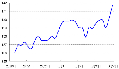 上周日本大地震加大了外汇市场的波动,欧元对美元突破1.40美元,美元对日元在七国集团的干预下从历史低点77.16反弹到80日元上方,人民币对美元日间波动受客盘影响较大