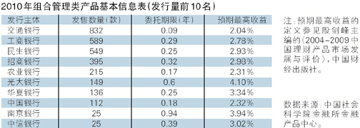 我们对组合管理类产品年度之最进行了盘点:国有控股类银行发售数量最多,为1755款;人民币类理财产品数量最多,为2987款;交通银行数量最多,为832款。其中民生银行发售组合管理类产品549款,占其该行2010年发售总量564款的97%强。由于该类产品的投资方向和投资组合不明,达不到产品的评价要求,所以民生银行2010年信息透明度单项指标和综合排名指标较为落后。 (中国社科院陆家嘴研究基地金融产品中心)