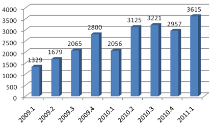 普益财富监测数据显示,2011年第一季度(以下简称“本季度”)共发行银行理财产品3615款,环比增加22.25%,同比增加75.82%。上一季度信贷类受政策限制而大幅减少,造成了银行理财产品总发行量环比下滑,而本季度产品的发行情况则表明了市场的快速适应能力,某一类理财产品的减少并不能阻碍其总体向前的趋势。(图1)