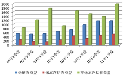 保证收益型产品主要包括债券和货币市场类产品和结构性理财产品。债券和货币市场类理财产品从去年四季度以来承担了替代信贷类理财产品的作用,发行量迅速扩大,但是本季度该类产品发行量基本与上一季度持平。结构性理财产品一直以来发行量都较为稳定,增长也较为有限。以上两类产品的稳定发行造成了保证收益型产品的总体平稳。另外,保证收益型产品的收益水平相对较低,在当前货币资金面趋紧,市场利率走高的情况下,其收益对投资者来说吸引力较小,难以带来需求的大幅增长。(图3)