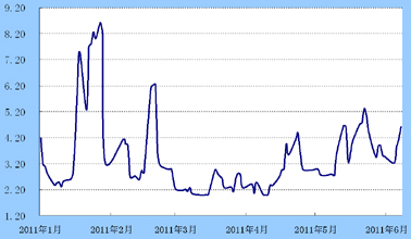 货币市场:受存款准备金率处于高位,以及农行500亿元次级债缴款等因素影响,市场资金面紧张,货币市场利率普遍上行,7天回购利率上升114bp至4.61%