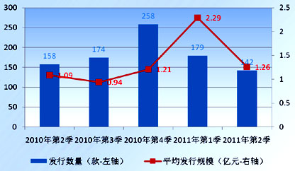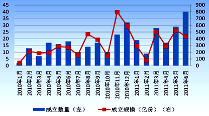 2011年二季度基金成立数量持续回升,共有86只产品成立,出现了基金史上最为密集的发行高潮,截至2011年上半年,成立基金数量为142只,而2010年仅成立179只。(图5)