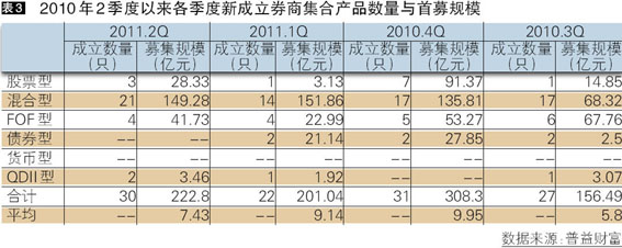 总体来看,自2010年下半年以来,A股市场进入“箱体”震荡行情,股票型产品成立数量减少,混合型产品逐步成为券商集合理财产品的中坚力量。其中,混合型产品成立数为21款,占新产品成立数量的70%;股票型产品成立数量为3款,较上季度增加2款;FOF型产品成立数量为4款,与上季持平;此外,招商海外宝和光大全球灵活配置分别于