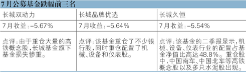重仓持有贵州茅台、双汇发展、五粮液的兴全有机混合毫无悬念地夺得了7月份混合型基金涨幅榜的冠军,月净值涨幅达8.07%;本月垫底则为近两成资产持有铁路设备制造板块股票的长城久恒平衡混合,月跌幅达6.03%;曾有突出表现的嘉实增长本月仍然徘徊在前十位置,月净值上涨4.07%;长期关注的博时价值增长贰号则继续了上个月的疲软走势,本月下跌0.41%,排名靠后。