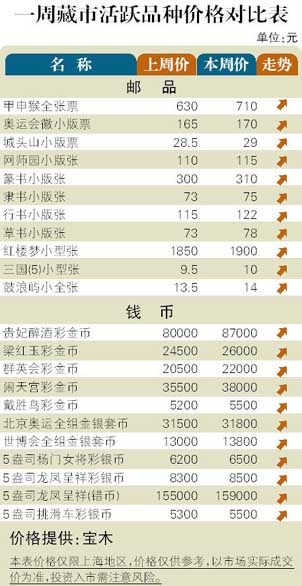 8月下旬藏市表现趋强,市场热点明显增多,创新高品种有增无减。邮市:JT板块热点快速增加,不少品种呈创新高之态,其中“西厢记”、“簪花仕女图”和“奔马”小型张创出1050元、1350元和4550元新高。近期热点新邮中的双连小型张再度逞强,其中“洛阳世展”双连张攀高至125元,“改革开放”和“世博会”双连张回升到82元和65元,“甲申猴”全张票回升到680元附近。币市:“贵妃醉酒”彩金币一骑绝尘,本周初已创8.7万元新高,“京剧脸谱”第一组和第二组金银套币分别上扬至9500元和8500元,“清华大学”金银套币回升到12300元附近。