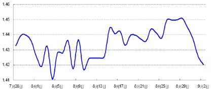 上周美元汇率阶段性调整,呈现大幅反弹趋势。美元兑欧元汇率从前一周五的1.45美元调整至上周五的1.42美元