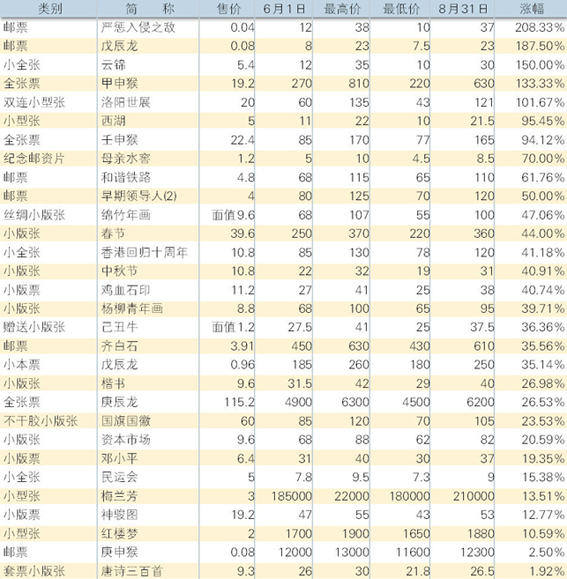第一轮生肖票的表现相对滞后,“辛酉鸡”、“癸亥猪”、“甲子鼠”和“庚午马”全张票分别上攀到33500元、11500元、5500元和1300元,而在12000元下方盘旋半年之久的“庚申猴”邮票,也在8月下旬微升到12300元,再创历史新高。