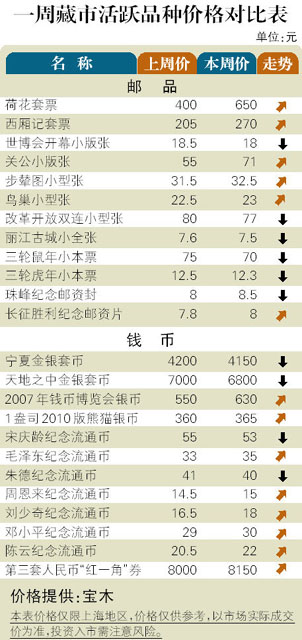 9月中藏市冷热不均,邮市继续成为“老邮”舞台,新邮阴跌不止。金银币市场重陷盘旋,但价格波动幅度有限。邮市:以JT板块为主的“老邮”继续逞强,创新高品种均系前期滞涨对象。如“留园”、“山茶花”、“民族乐器”、“戒烟”和“柯棣华”等套票扬升到660元、265元、280元、110元和23元历史高位。此外,本周新邮总体下挫,惟新发行的“关公”高开高走。币市:金银币交易量继续萎缩,近期新品仍在回调,“清华大学”金银套币回落到10300元,“京剧脸谱(2)”金银套币微挫至8400元。不过2007版“钱币博览会”银币价格升至650元,一个月涨幅达20%。