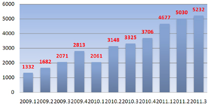 普益财富监测数据显示,2011年第3季度(以下简称“本季度”)共发行的银行理财产品5232款,环比增加4.01%,同比增加57.35%。今年以来,银行理财产品发行数量一直维持在高位,截至2011年3季度末,发行量已逼近1.5万款,超过去年全年总发行量。(图1)
