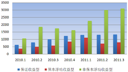 从银行理财产品的风险收益特征来看,各风险类型产品发行总量均小幅上涨。其中,保证收益型产品自2010年4季度以来一直保持较为稳定的发行量,本季度发行1330款,环比增加16款,增幅为1.21%;保本浮动收益型发行803款,环比增加83款,增幅11.53%,因为基数较低,成为本季度增长幅度最高的类型;非保本浮动收益型发行3099款,环比增加103款,增幅为3.44%。本季度各风险收益类型产品的发行量没有出现明显变化说明市场状况没有出现重大转向,银行资金依旧紧张,投资者的投资风格较为谨慎。