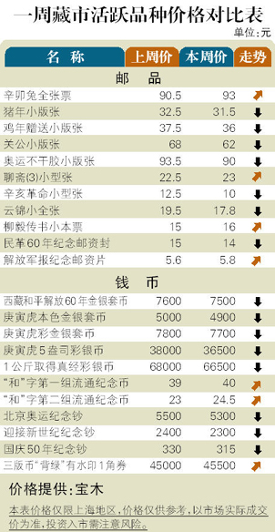 藏市的调整状态延续到10月下旬,邮市和币市的热点均现萎缩,但市场成交量并没有明显下降。邮市:JT票下跌已基本止住,大多数品种成盘旋状。其中“齐白石”套票回升到920元,“庚申猴”邮票微涨至12500元。新发行的新邮全线下滑,高开低走表现十分清晰,其中“辛亥革命”小版张和小型张分别下滑到21元和10元,“明清家具”和“八十七神仙卷”小本票分别回调至12元和17.8元。币市:金银币下跌力度减弱,但买气明显不足。新发行的“辛亥革命”金银套币回落到5500元,而龙头品种“贵妃醉酒”彩金币则继续下挫至73000元,表明调整尚未结束。