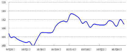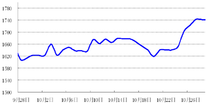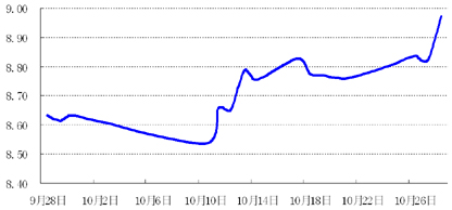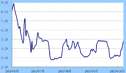 货币市场:近三周,央行在公开市场实现净回笼,加之10月末企业陆续开始缴收利税,银行间市场资金价格上周有所上涨,7天回购利率涨幅超过150BP,收于5.10%