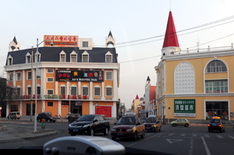 珲春街景:同样吸取了俄罗斯建筑的风情。当地门牌标识普遍用中文、俄文、朝鲜文三种文字。