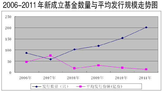 不但单只基金首发规模下降,就是总体规模也呈下降趋势。近三年来,新发基金数量以30%的幅度递增,但总规模却以近20%的速度下降,2009年、2010年、2011年新发基金规模分别是3722亿、3169亿和2368亿元,基金总资产规模由2007年的3.28万亿下降到2010年的2.5万亿,2011年以来一直在2.2万亿左右徘徊。