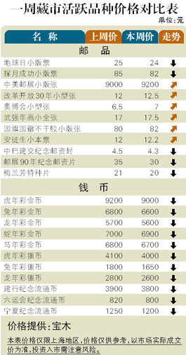 12月中旬的藏市略显回稳,箱体整理的盘桓格局未变。邮市:新邮略有企稳,前期跌势得以缓解,但低迷形态依旧。其中“天津滨海新区”和“美好家园”小型张本周初价格分别为4.3元和4.6元。而“富春山居图”小版票已创出98元新高,双联小型张中的“洛阳世展”和“世博会”分别攀升至86元和52元附近。币市:“壬辰龙”金银币和“水浒”金银币依然是币市短线聚焦所在,但因原始货源不断出现,其中“壬辰龙”彩金银套币和本色套币分别维持在4350元和4100元,5盎司“壬辰龙”彩银币则盘桓在7400元附近。“水浒”第三组彩金银币价格为1300元。