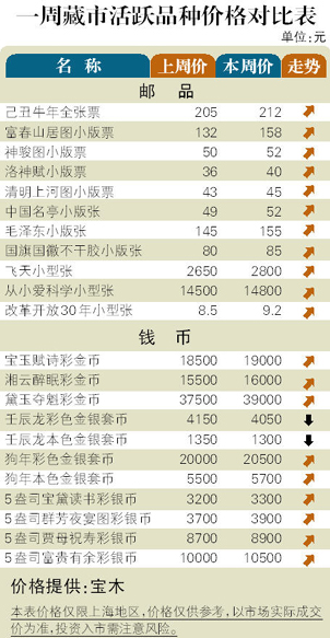 刚刚过去的一周,藏市热点明显增多,大量强势邮票出现价格上扬状态,而金银币表现依然温和,但成交有所放大。邮市:“壬辰龙”版张仍然独领风骚,全张票创出385元新高,小版张则走高到95元附近,后者的升幅超过全张票。受此影响,第三轮生肖版张全线上涨,其中“甲申猴”全张票回升到680元。币市:金银币价格变化不大,但“壬辰龙”金银币和2012版“熊猫”金银币成交酣畅,其中“壬辰龙”本色金银套币维持在4000元附近,而“壬辰龙”彩金银套币则微沉至3900元,2012版“熊猫”1盎司金币价格在11500元附近。