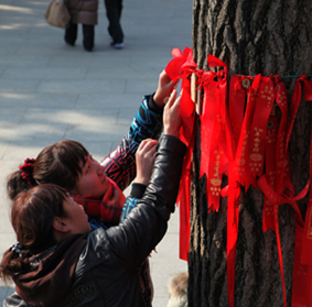 2012年初一早上,南京栖霞寺。“爸爸!爸爸!”小女儿指着那些飘动红色物体说“哪些东西是什么呢?”我牵着女儿好奇地走过去询问寺院里的工作人员。原来,那些红色的物体是用纸和布做成的吉祥卡及吉祥带。每年初一,许多人携全家老小都要在这里请上一张吉祥卡或者一条吉祥带,把祝福的话语和自己的姓名写在上面,然后用一支长长的竹杆把它高高挂到庭中古树上。这象征着鸿运当头,高高在上。