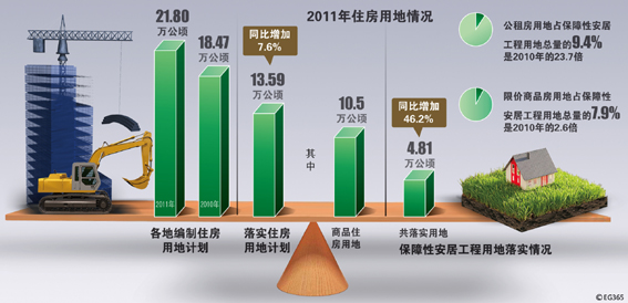 2月份,国土资源部土地利用管理司副司长通报2011年房地产用地管理调控情况。2011年,各地编制住房用地计划为21.80万公顷,是 2010年计划(18.47万公顷)的1.2倍。截至