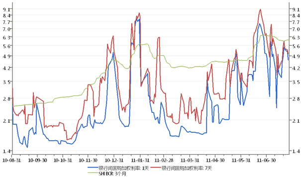 从2011年年初开始,银行间市场资金供给异常紧张,主要受去年11-12月三次上调法定准备金率的影响,加之元旦、春节临近,企业和居民手持现金的需求增加,各商业银行均面临存款提现的要求,导致流通中的货币M0急剧增加,M0在1月同比增幅达到创纪录的40%,一揽子的紧缩政策和节日因素制约,导致银行体系超储率逐步走低,以往在货币市场融出资金的大行开始融入资金。1天和7天回购利率分别大幅飙升至5.8%和7.5%,均突破了去年年底的高位。(图2)