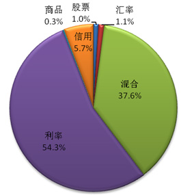 从产品的资产主类来看,利率类产品依旧是占到了所有产品数量的半壁江山,共发售11010款,同比上升101%,占比达54.3%,但较去年占比下降了0.9%。混合类产品发售数量居次,共发售7630款,同比上升145%。占比为37.6%,较去年上升6.2%。2011年,信用类产品共发售1153款,占比5.7%,同比上升7.7%,但较去年占比下降5.1%。汇率类产品则发售227款,较去年的71款,同比上升了219%,但仅占今年产品总数量的1.1%。股票类和商品类产品分别发售了196款和54款,占比为1.0%和0.3%。总体而言,除汇率类产品和混合类产品之外,其余各类产品占比较去年都有所下降。详见图3