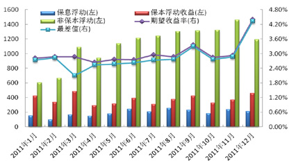 从理财产品收益类型来看,2011年理财产品的收益类型分布较去年有些许变化。2011年非保本浮动收益型产品共发售13470款,同比上升178%,占2011年产品总量的66.4%,较去年占比上升了18个百分点。而保本浮动收益型产品和保息浮动收益型产品的占比分别下降了11个和6个百分点,占比分别为22.2%和11.4%。图4展示了2011年各月度不同收益类型产品的数量和收益水平的变化趋势。