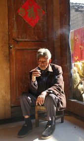 走进何绍从家的院子,就看见一只小板凳上坐着一个苍老的背影,在满是杂物的院子里,背对着太阳,吸烟,还没有看见他的脸,就看见了一缕缕青烟把老人包围着,弥漫着。听见儿子招呼说:“有客人来了!”老人才慢慢起身,转过来,面无表情,嘴巴轻轻一动说:“来啦?”