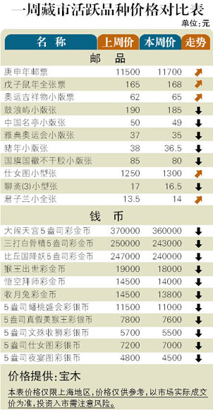 上周藏市又陷入小幅波动的拉锯状态,但上旬的抛压有所收敛,大多数品种的价格趋于稳定,惟成交依然局促。邮市:小版张成为近期下跌的主流板块,尤其是价格一直坚挺的2003─2004年小版张货源略增,其中“古桥”、“羊年”多版式小版张分别下挫到450元、270元,“崆峒山”、“毛泽东”小版张分别回调至190元、175元。币市:彩金币的跌势趋小,但尚无触底征兆。“壬辰龙”本色金银套币和彩色金银套币分别微挫到3400元和3700元附近。新发行的“熊猫金币发行30周年”金银币货源日趋增加,其中的1盎司金币和5盎司银币分别下滑到15600元和3400元。